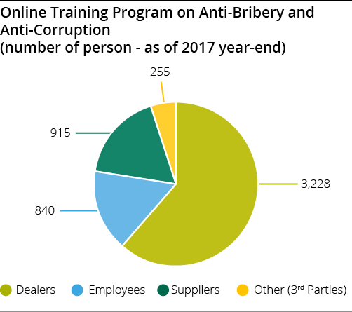 In order to recognize and adopt Tofaş Code of Ethics, we conduct online training and refresher activities that include Code of Ethics and Anti-bribery and Anti-corruption Policy. In addition to theoretical information, this training program includes case studies that one may encounter in business life and is offered not only to employees but suppliers and dealers as well. As of the end of 2017, a total of 5,238 employees, 3,228 of which were dealer employees have received online training. We believe that awareness on anti-bribery and anti-corruption has improved compared to the previous reporting period thanks to the online trainings we offered in 2016 (online ethics training which is updated in the first quarter of 2018, was assigned as a compulsory program to all employees, and as of the end of March 2018, 226 personnel have completed this training). In 2017, we renewed employee declarations on conflict of interest.